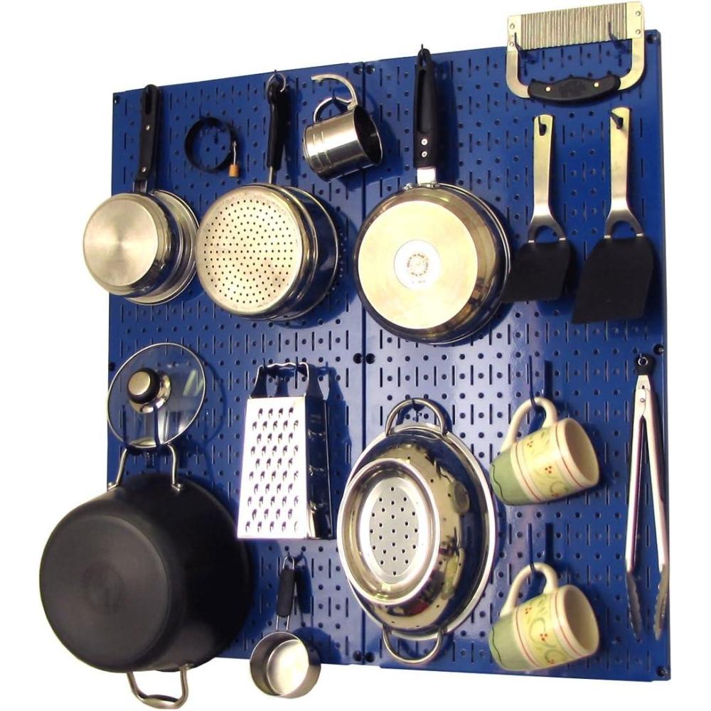 Wall Control Kitchen Pegboard Organizer Pots and Pans Storage Rack Organization Kit with White Pegboard and White Accessories(Blue Pegboard Blue Accessories)