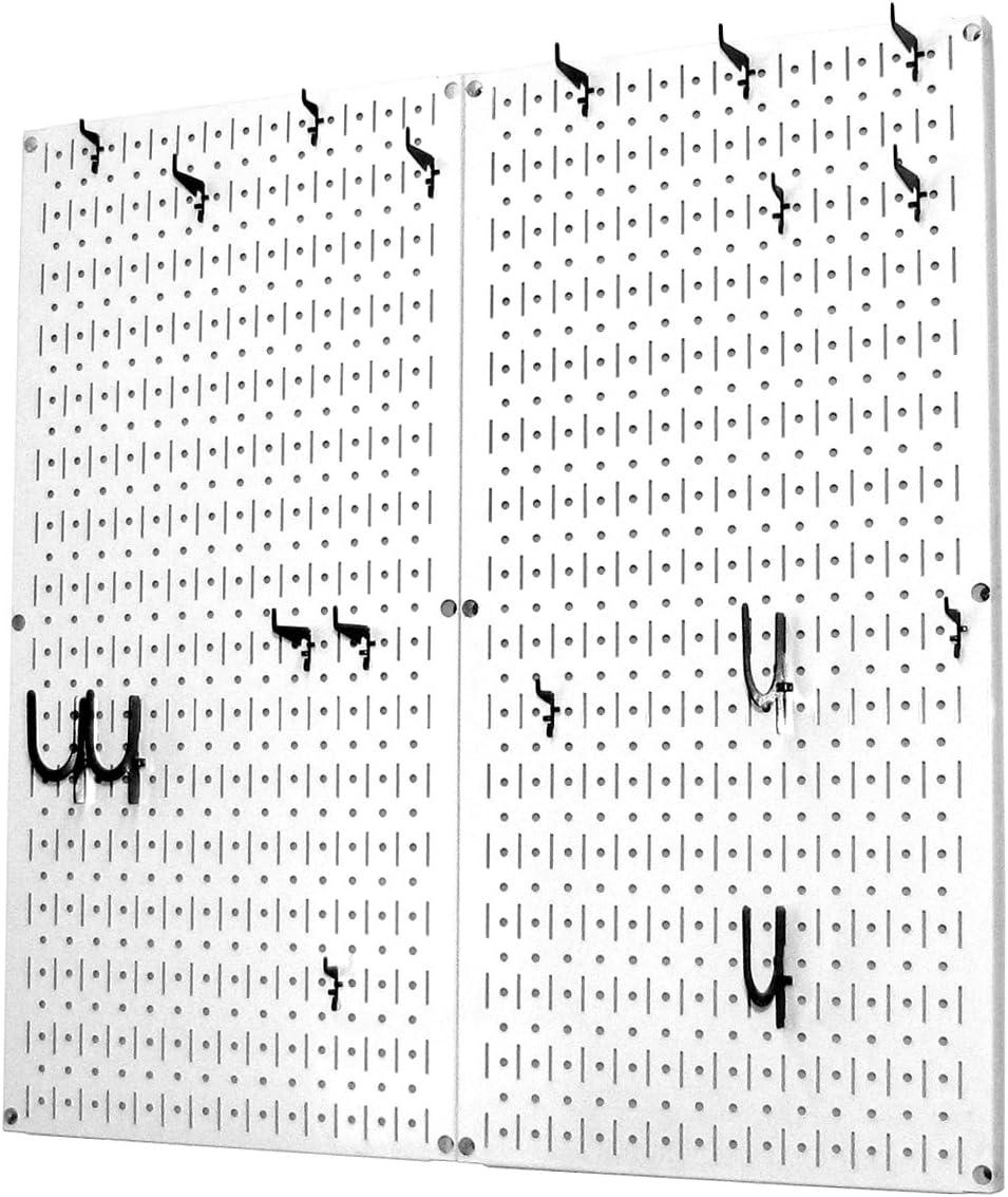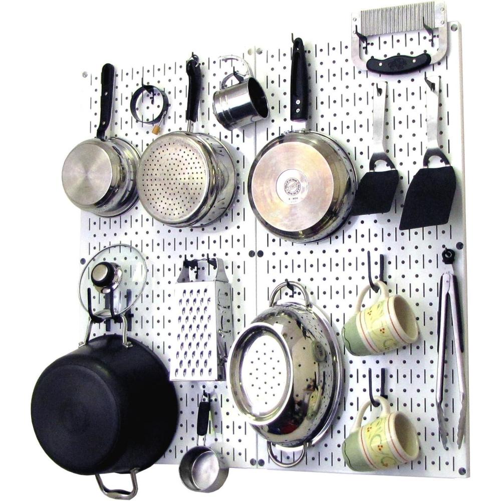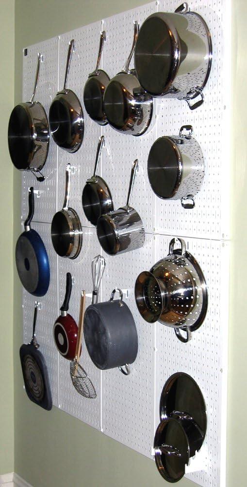 Kitchen pegboard storage and organization for pots pans and kitchen supplies, Wall Control's chic Kitchen Pegboard Pots and Pans Pegboard Organizer Storage and Organization Kit has kitchen storage and organization needs covered. Wall Control combines the simplicity inspired by a Julia Child pegboard storage and organization system with the modern touches of a high end kitchen by creating attractive wall mounted pegboard storage with strong and durable chic metal pegboard panels that will last a lifetime and are over 10 times stronger than conventional kitchen pegboard. Two 16in x 32in powder-coated metal pegboard panels combine for a total kitchen storage area of 32in x 32in, over 7 Square Feet of kitchen pegboard storage space and you can always add more kits to create a larger kitchen pegboard storage area. The pegboard panels offer both slots and holes to accept modern chic slotted tool board accessories as well as conventional 1/4in Julia Child style peg board hooks making this pegboard extremely versatile by allowing for a wide range of kitchen pegboard hooks and supplies. The chic slotted tool board hooks included improve hook stability for more hassle free kitchen supplies storage and organization. Versatile, durable, and attractive metal pegboard panels are an easy-to-use kitchen supplies storage solution for kitchen utensils or pots and pans. The metal pegboard panels are easy to install into studs or walls and install in a matter of minutes. A built-in frame provides ample hook clearance and full access to all holes without requiring additional framework or using up pegboard holes for mounting. Mounting hardware is included. Wall Control Kitchen Pegboard Products are Made in USA. The Kitchen Pegboard Pots and Pans Storage and Organization Kit Includes: (2) White Kitchen Pegboards 32in x 16in, (18) White Assorted Kitchen Tool Board Hooks for organizing pots pans and kitchen supplies. Kitchen Supplies Not Included.