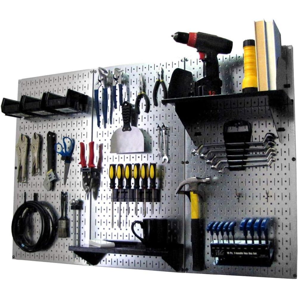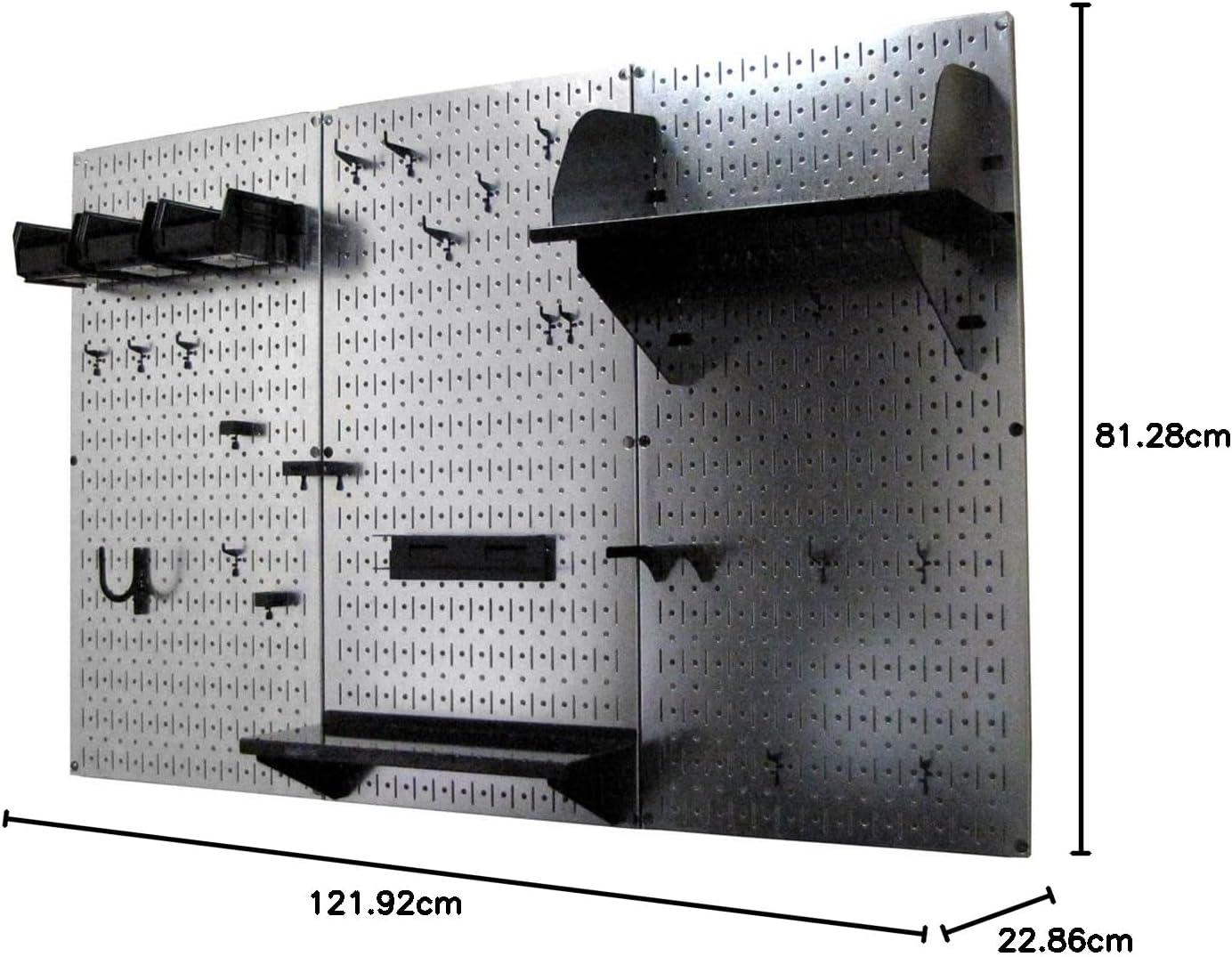 The Wall Control Pegboard Standard Workbench Tool Storage Organizer Kit offers maximum tool board storage versatility and strength with over 10.5 square feet of pegboard storage space. Three 16in x 32in Black powder-coated pegboard panels combine for a total tool storage area of 48in x 32in which will accommodate many pegboard hooks. The attractive Metal Pegboards are great for heavy duty tool board storage needs due to their 20 gauge steel construction that will not warp, fray, or crack and are over 10 times stronger than conventional pegboard creating an industrial grade tool storage solution that will last a lifetime. Wall Control metal pegboards offer both slots and holes to accept slotted tool board accessories as well as conventional 1/4in peg board hooks making this pegboard extremely versatile by giving the user multiple options with tool board accessory selection. The patented engagement of the slotted tool board hooks included improves hook security for more hassle free tool storage. These versatile, durable, and high strength metal pegboard panels are an easy-to-use tool storage solution for any garage, shop, or tool crib. The metal pegboard panels are easy to install into studs or flat surfaces with pre-drilled mounting holes on 16in centers. A built-in frame return flange provides ample hook clearance and full access to all holes without requiring additional framework or using up pegboard holes for mounting. Mounting hardware is also included. Wall Control Pegboard Products are Made in the USA. The Metal Pegboard Standard Workbench Organizer Kit Includes: (3) Black Powder-Coated Metal Pegboard Panels 32 in. x 16 in. (Covers 48 in. x 32 in. when Installed), (1) 9 in. Shelf Assembly, (1) 6 in. Shelf Assembly, (3) Plastic Hanging Bins with Bin Hanger, (1) Screwdriver Holder, (1) Hammer Holder, Assortment of (20) Additional Hooks and Brackets. Mounting Hardware is Included. Black Pegboards with Black Tool board Accessories. Tools and Tool Sets Not Included.