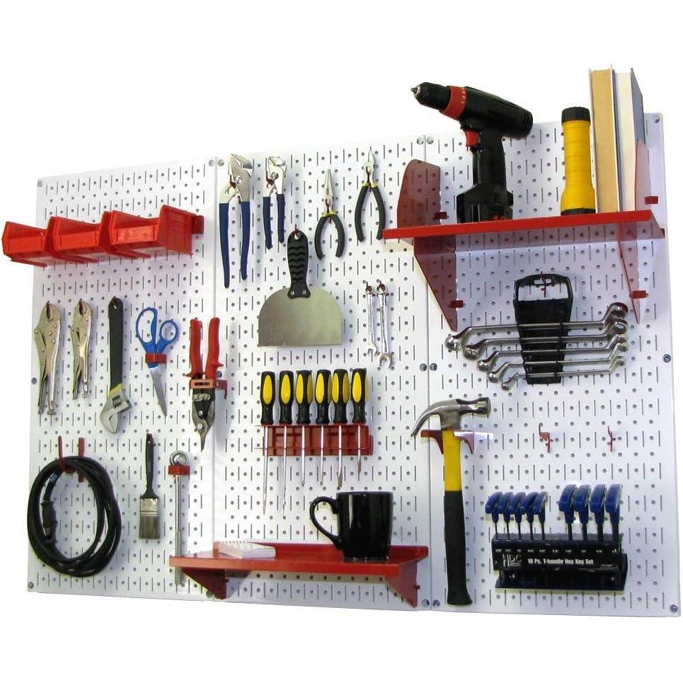 Wall Control Pegboard Organizer 4 ft. Metal Pegboard Standard Tool Storage Kit with Black Toolboard and Black Accessories(White Pegboard Red Accessories)