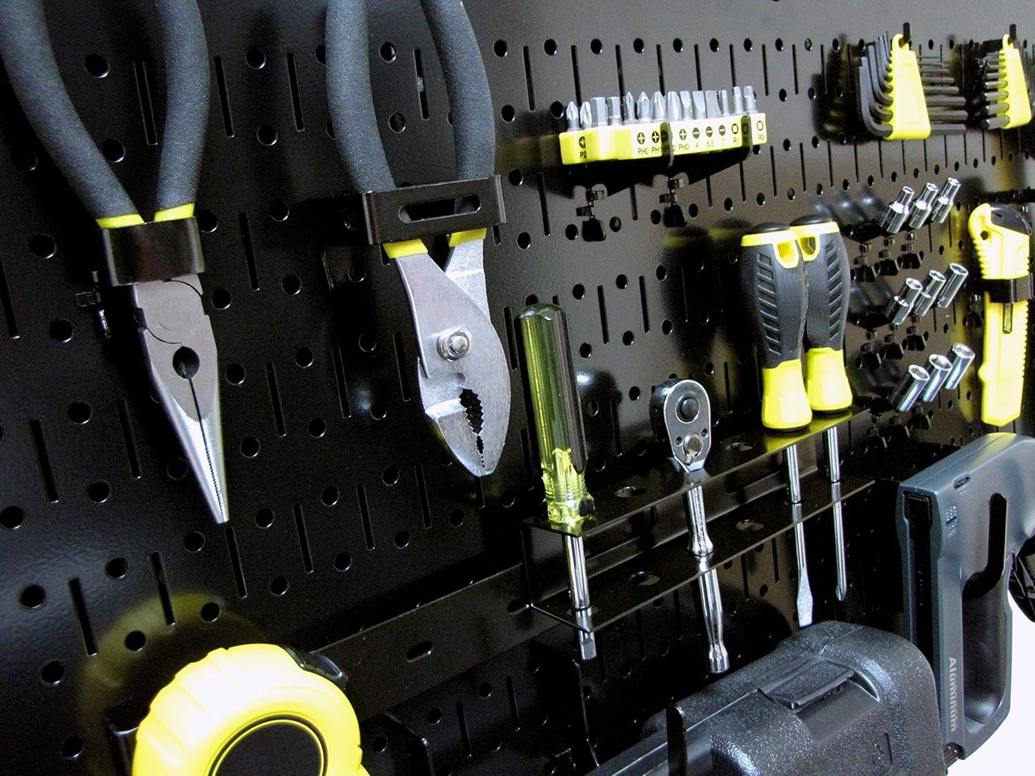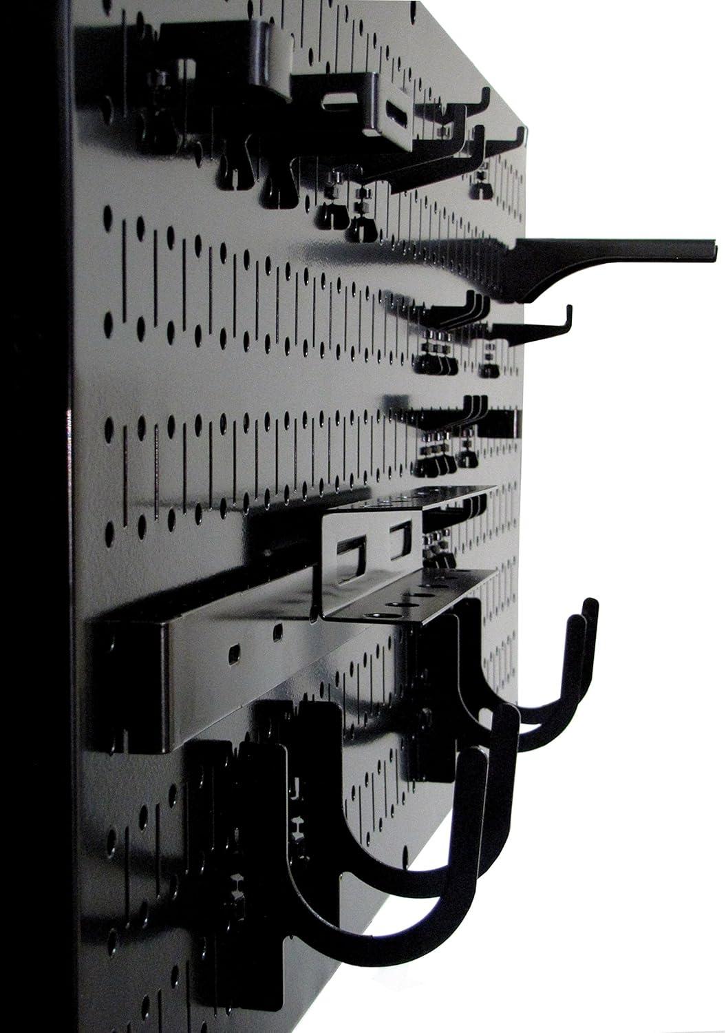 Wall Control Horizontal Black Metal Pegboard Panels offer a level of quality and craftsmanship that is unmatched. There are several attributes that separate Wall Control Pegboard from the competition and put Wall Control Pegboards in a league of their own, first among them being quality and customer support. Wall Control Pegboard is Made in America and comes with a Lifetime Guarantee. Wall Control Pegboards offer superior construction and features a full flush-with-the-wall mounting flange. This is very important because it not only allows for easy installation and hook pass-through clearance but it also allows the screw heads of the included mounting screws to pass all the way through the panel face and make solid contact with the wall. Competitor brands often require you to tighten the screw head to the actual panel face leaving a big gap between the screw head and the wall for a very insecure attachment to the wall where the screw barely grips the wall or the drywall anchor, indents the panel face, and does not offer a secure installation that can safely hold the kind of weight a Wall Control Metal Pegboard is capable of holding. Wall Control Metal Pegboards offer a finish and appearance that is unmatched. Wall Control Black Metal Pegboards are Powder-Coated to offer both durability and a rich attractive appearance that prevents scratching much better than traditional paint. Other brands offer painted finishes that scratch easily and are not nearly as attractive or durable as the thick, powder-coated finish found on the Wall Control Steel Pegboard Panels. The Wall Control Metal Pegboard Home and Garage Tool Storage Pack includes Three 32-Inch Wide x 16-Inch Tall Wall Control Horizontal Black Metal Pegboard Panels that can be mounted side-by-side, top-to-bottom, or in separate locations altogether. Wall Control Pegboard Panels are modular so they can be tiled as needed to create large areas of pegboard wall-organization.