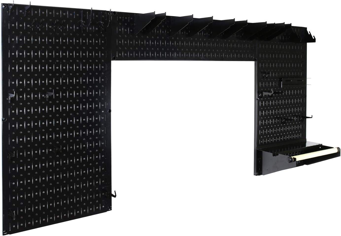 WOODWORKING TOOL STORAGE KIT INCLUDES: (2) 32in Tall x 16in Wide Metal Pegboards, (1) 8in Tall x 32in Wide Metal Pegboard, (10) 6in Clamp Rack Brackets, (1) Paper Towel Holder with 4in Deep Shelf, (1) Screwdriver Holder for 6 Standard Screwdrivers, (2) Slotted Bracket Holders, (2) 4in Reach U-Hooks (4) Curved Tip Hooks (8) 2-7/8in Hooks (6) 7/8in Hooks. Mounting Hardware Included.